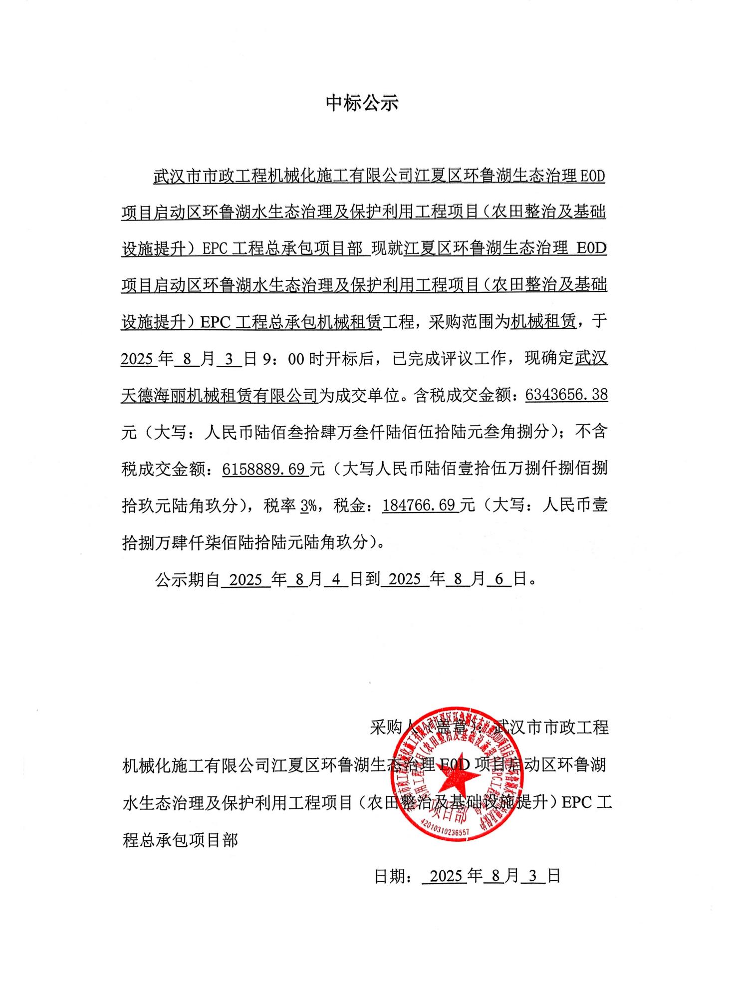 江夏區(qū)環(huán)魯湖生態(tài)治理 E0D 項(xiàng)目啟動(dòng)區(qū)環(huán)魯湖水生態(tài)治理及保護(hù)利用工程項(xiàng)目(農(nóng)田整治及基礎(chǔ)設(shè)施提升)EPC工程總承包機(jī)械租賃中標(biāo)公示