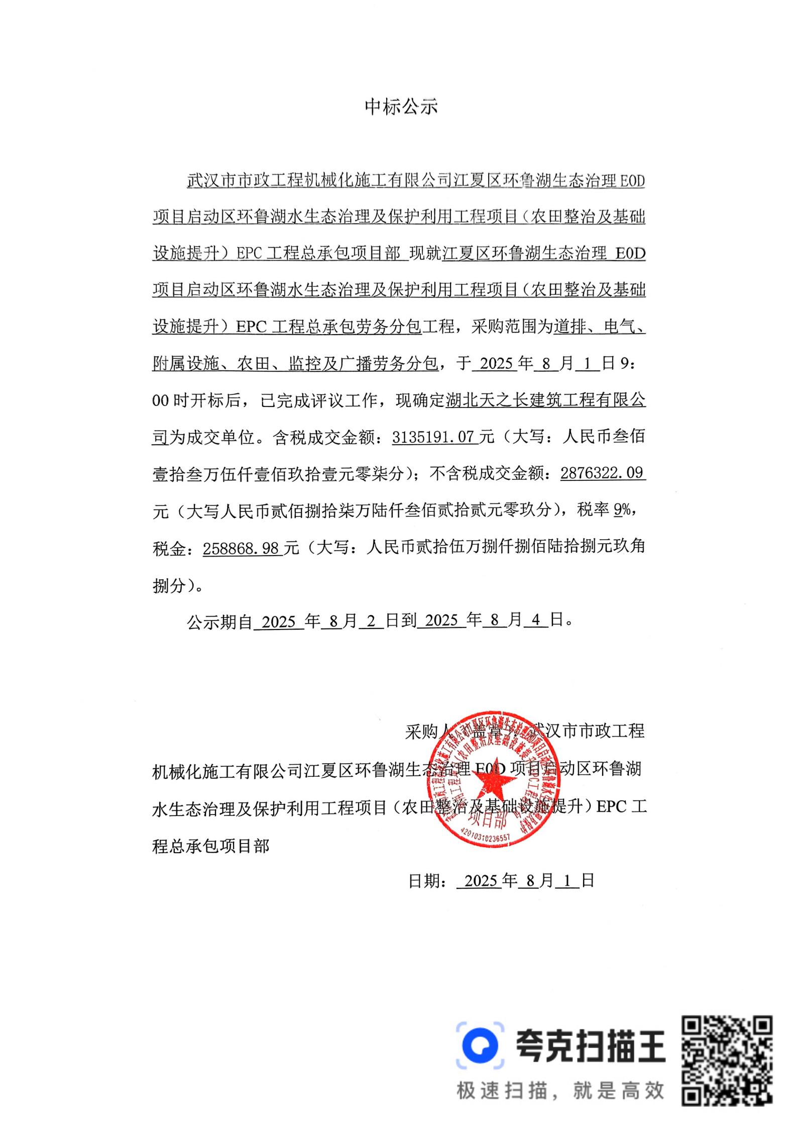 江夏區(qū)環(huán)魯湖生態(tài)治理 E0D 項目啟動區(qū)環(huán)魯湖水生態(tài)治理及保護利用工程項目(農(nóng)田整治及基礎(chǔ)設(shè)施提升)EPC工程總承包勞務(wù)分包中標(biāo)公示