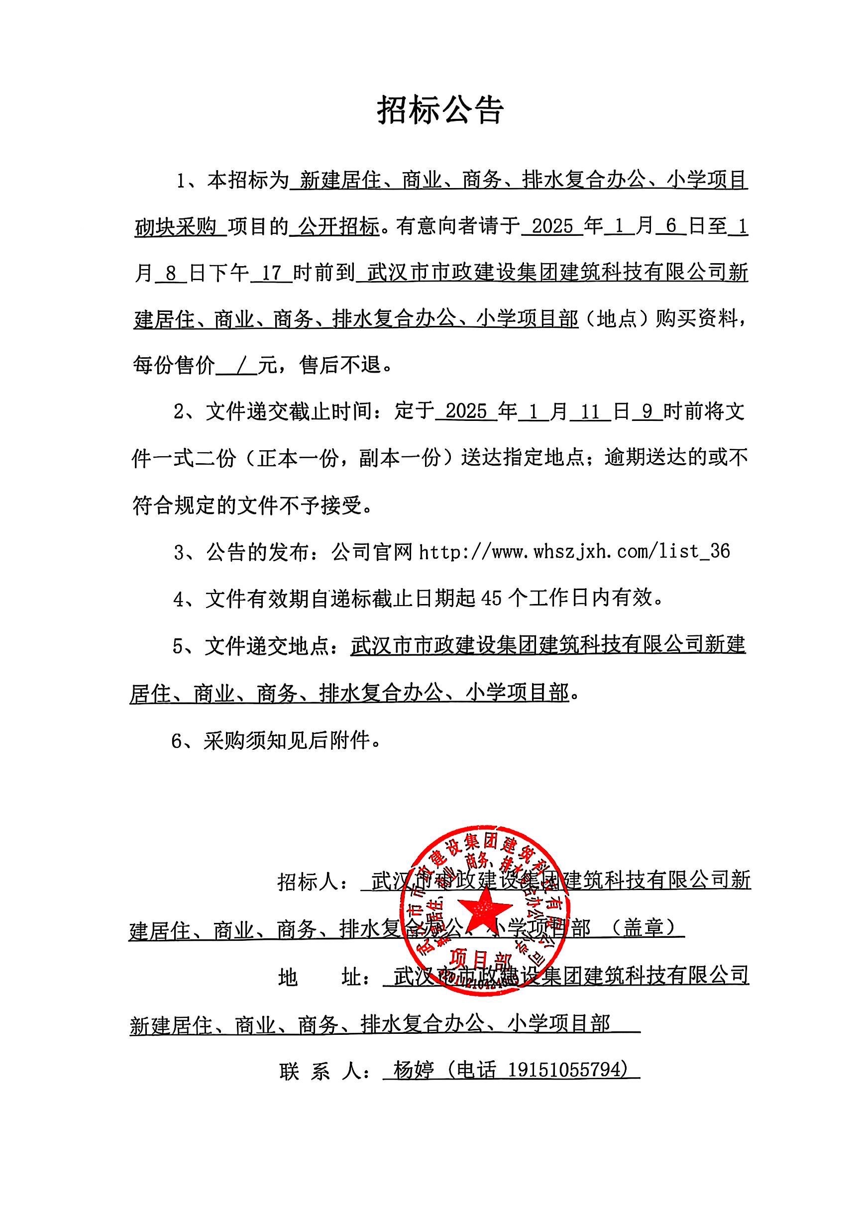 武漢市市政建設(shè)集團(tuán)建筑科技有限公司新建居住、商業(yè)、商務(wù)、排水復(fù)合辦公、小學(xué)項(xiàng)目砌塊采購招標(biāo)公告